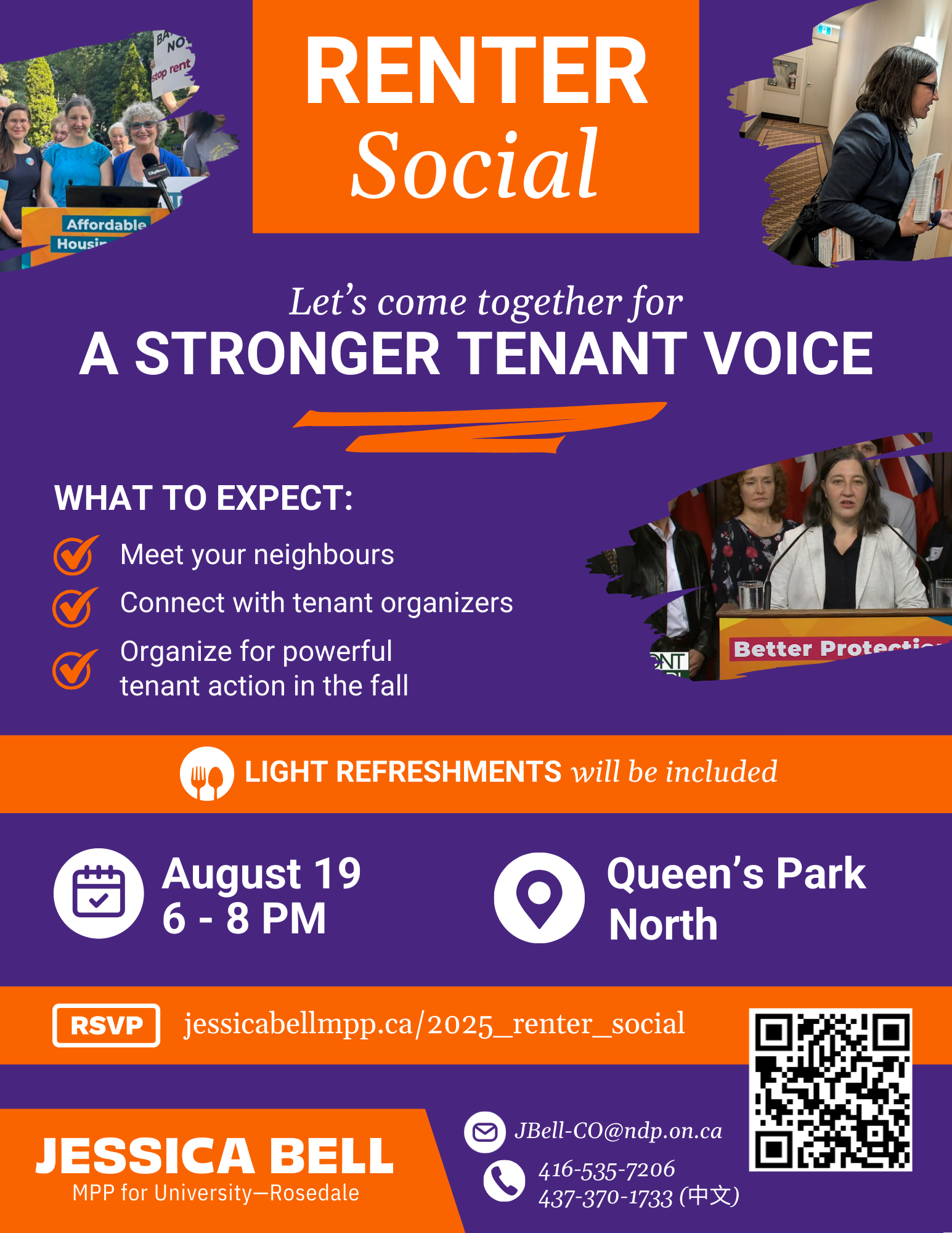 Are you a renter looking to build community and push for stronger housing laws? Join me, renters like you, and tenant organizers this Tuesday August 19 from 6 to 8pm at Queen’s Park North for our Renter Social!