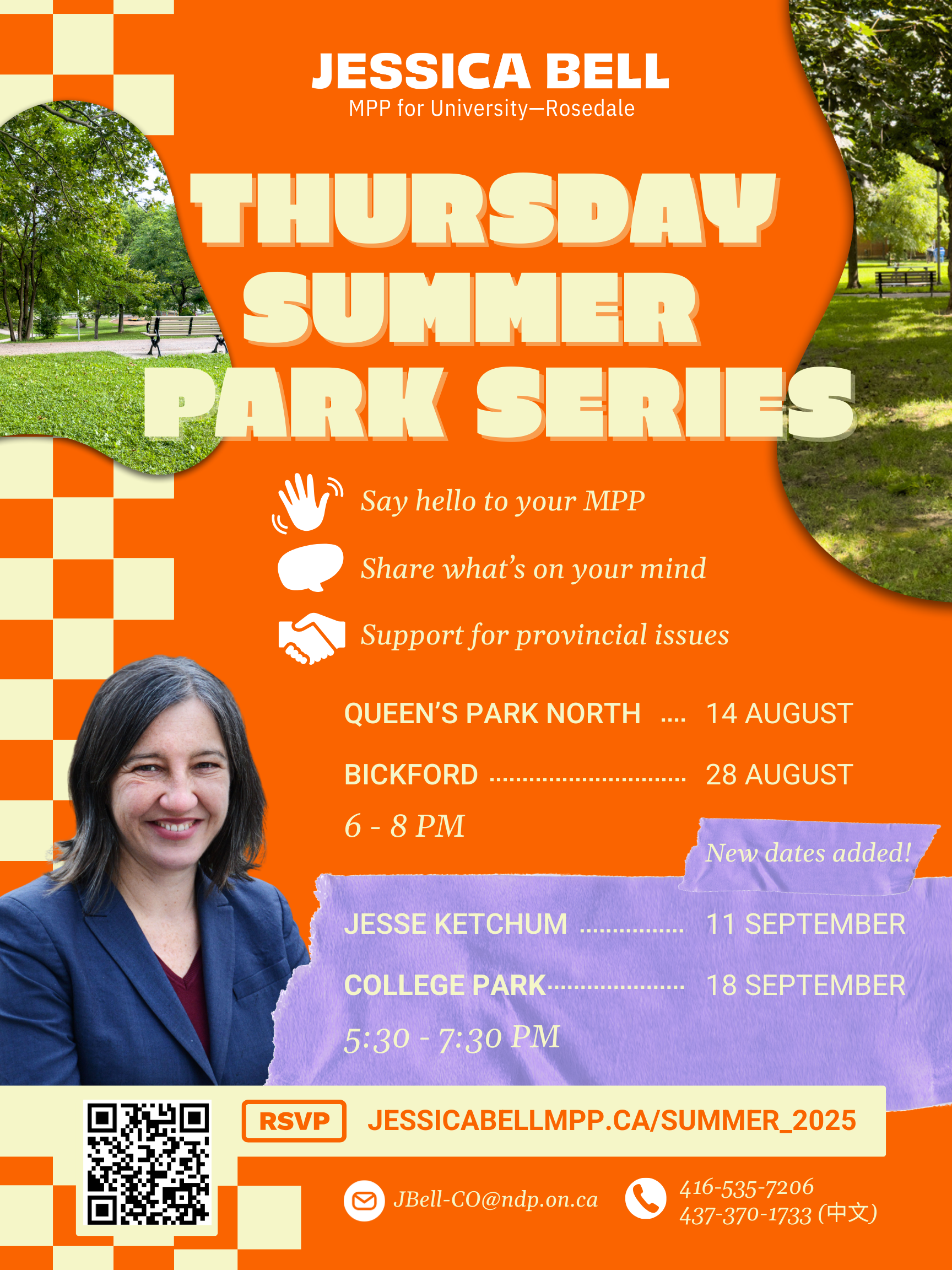 As August turns into September, I am continuing to bring my community office pop-up to local parks on Thursday evenings. Come by to say hello, share what’s on your mind, and find out how my team and I can help you with provincial issues.