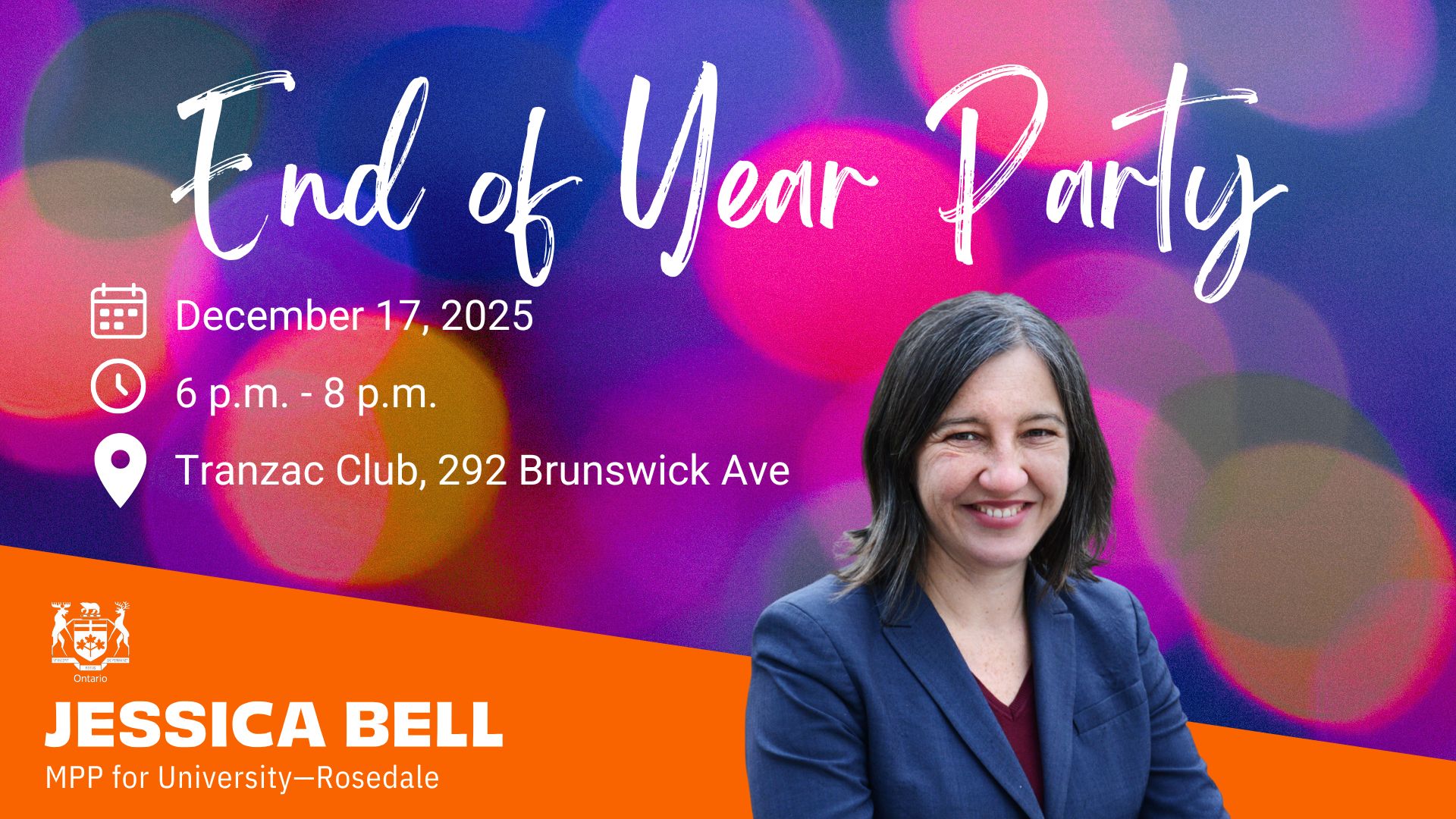 Join me, staff, volunteers, constituents, and neighbours on Wednesday, December 17 to celebrate the year and enjoy the holiday season together. Food and non-alcohol drinks will be provided.