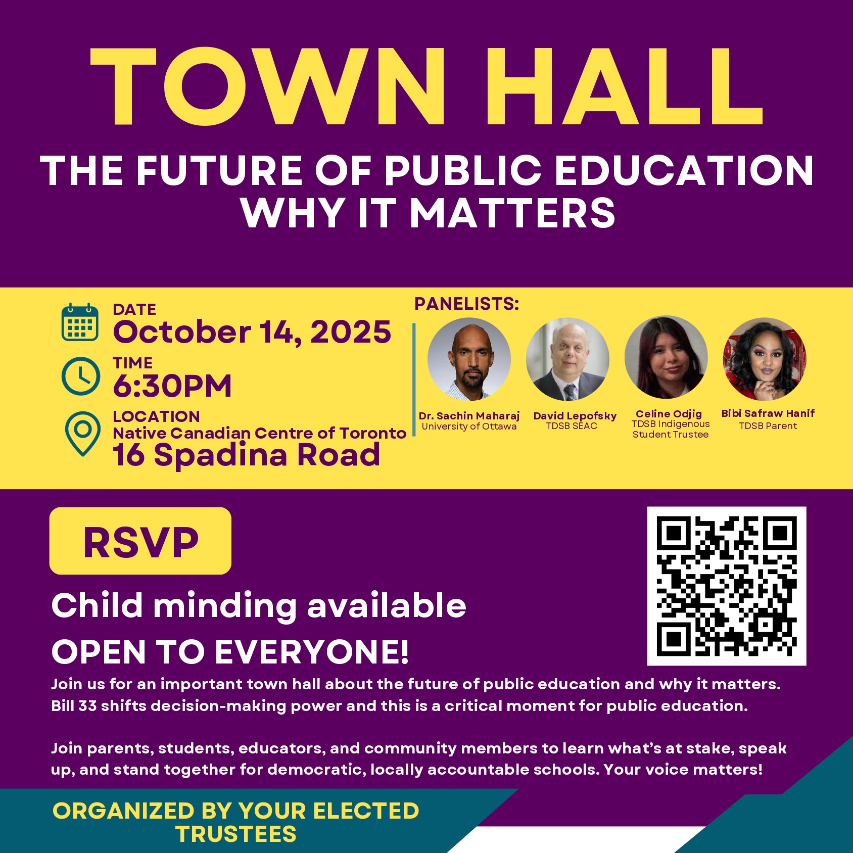 Join parents, students, educators, and community members on Tuesday, October 14 at 6:30 PM at 16 Spadina Road for a town hall hosted by elected trustees to discuss what’s happening in our schools.