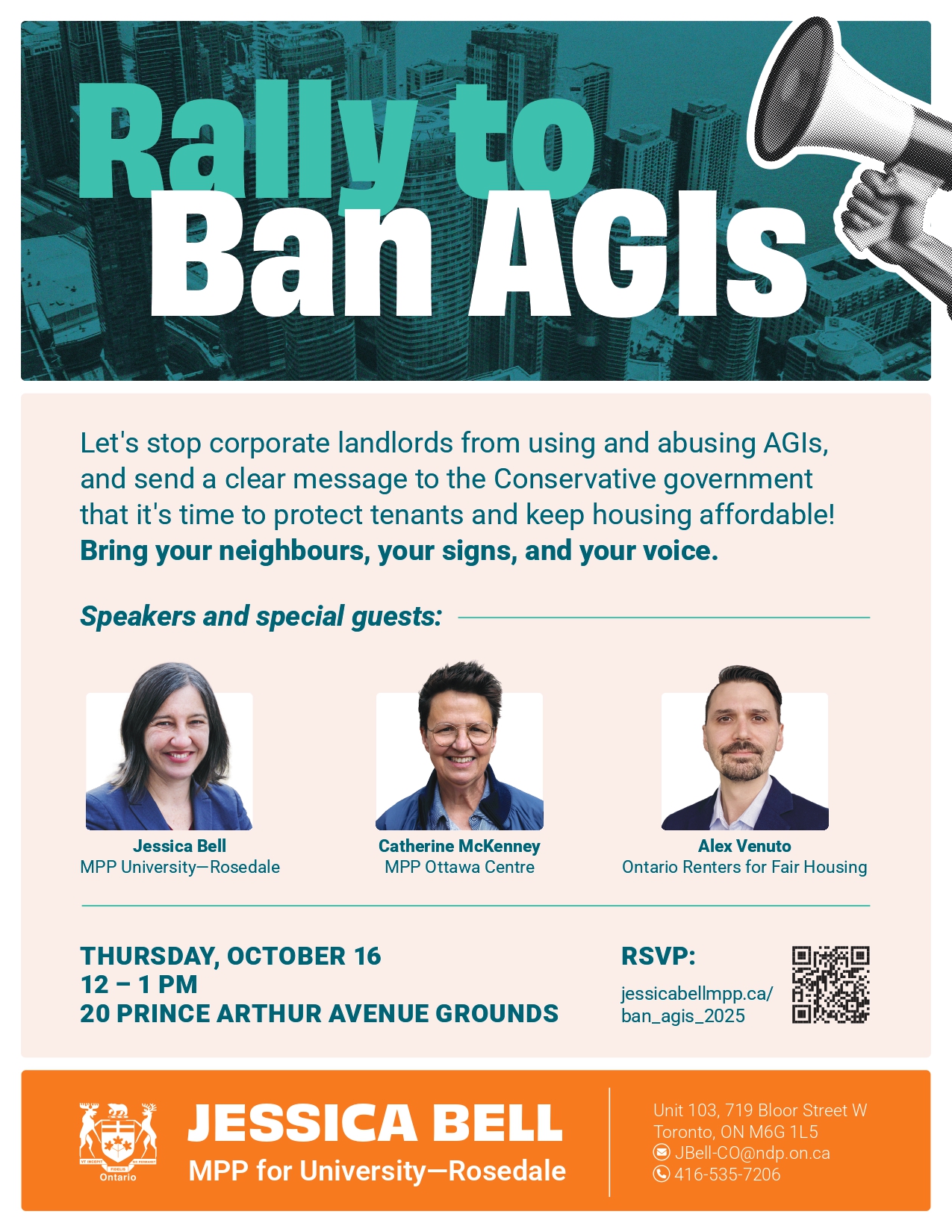 On Thursday October 16 at 12 PM, join me, MPP Catherine McKenney, Alex Venuto from Ontario Renters for Fair Housing, and tenant advocates at 20 Prince Arthur Ave to demand a ban on Above Guideline Rent Increases (AGI).